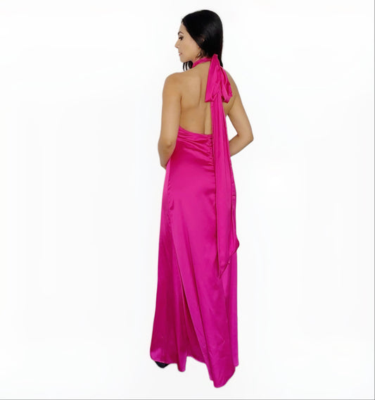 Vestido Largo Fucsia Halter Satinado